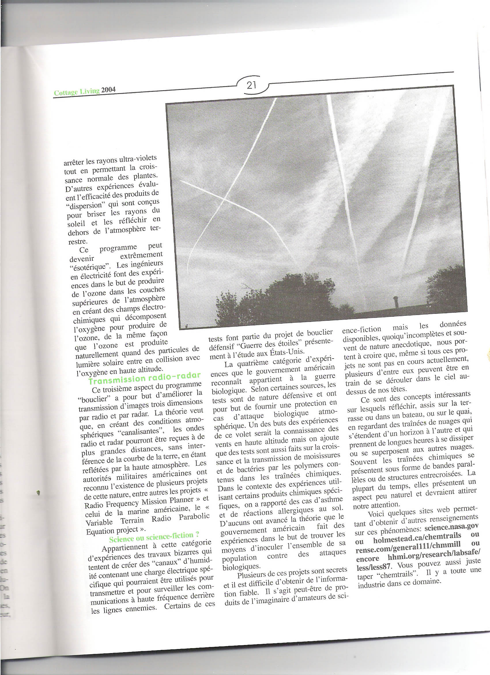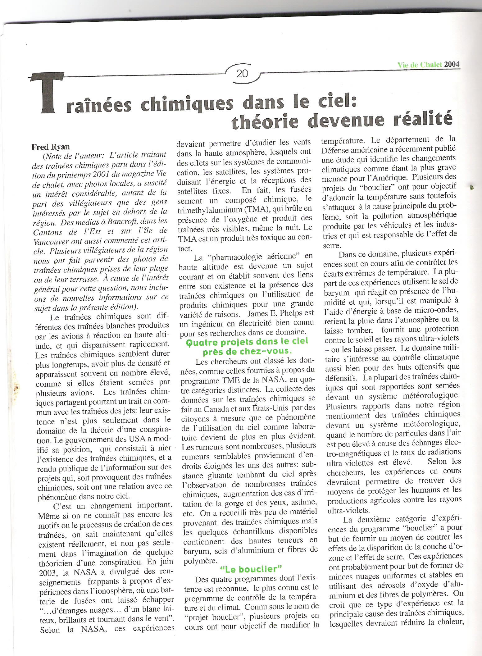 Article sur les chemtrails de Fred Ryan dans la revue Vie de chalet vol.4, édition du printemps 2004.