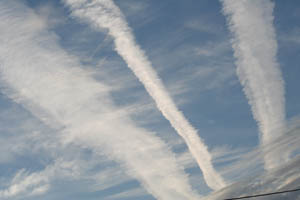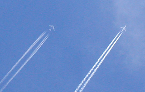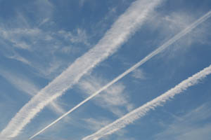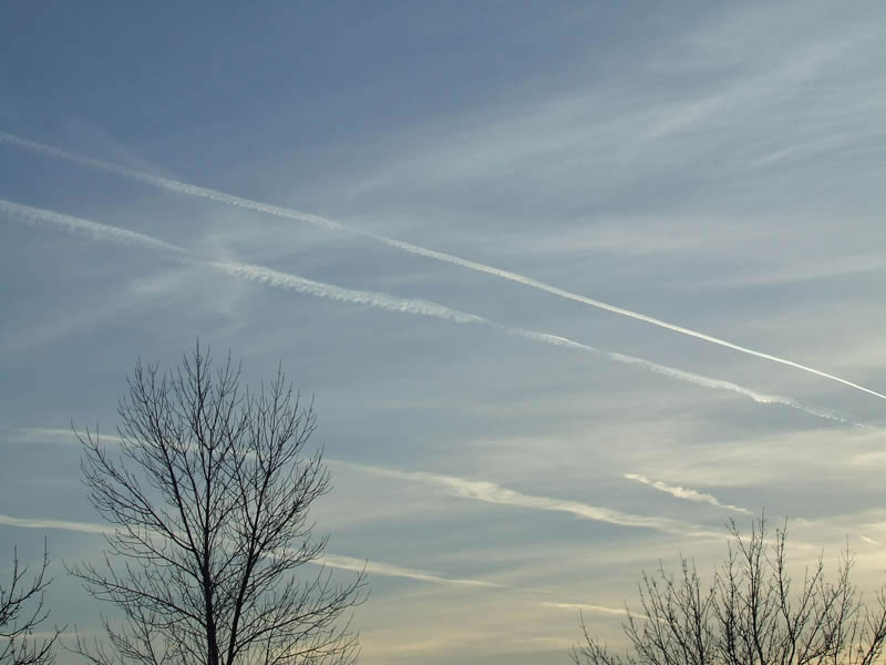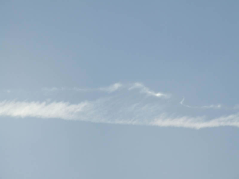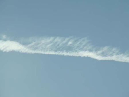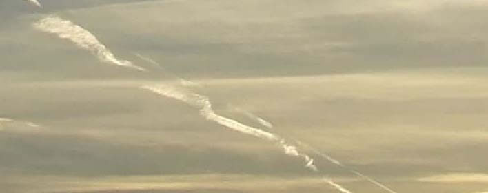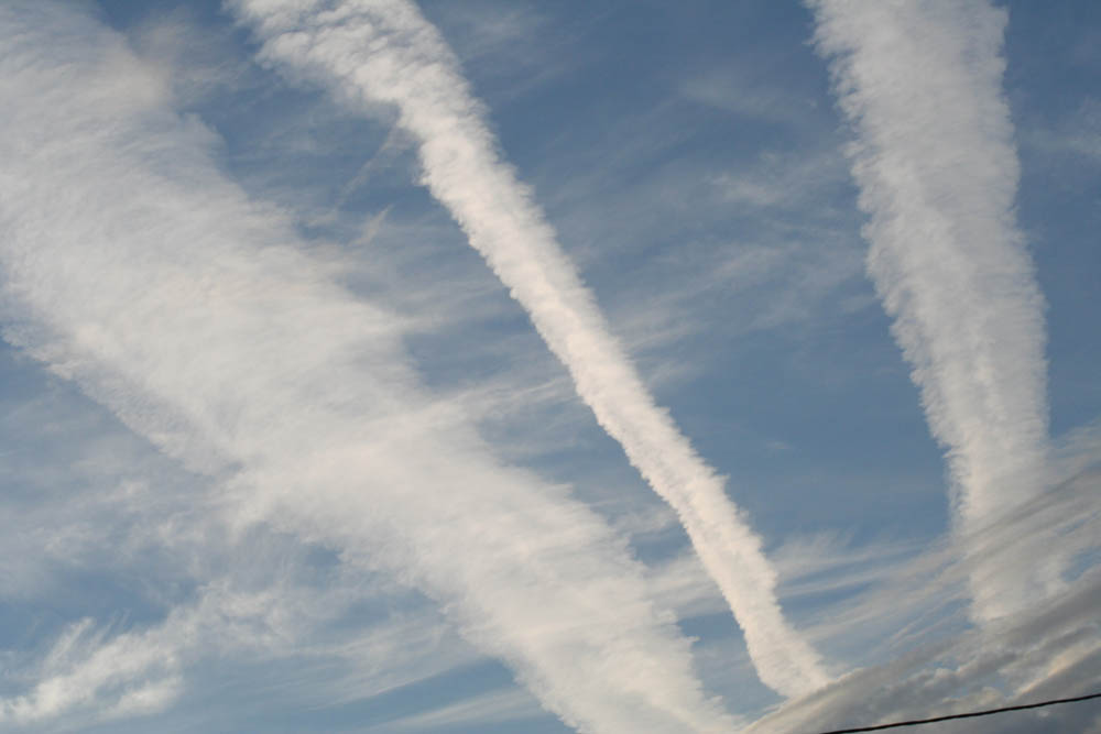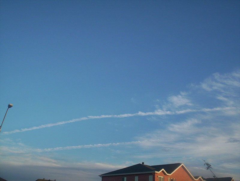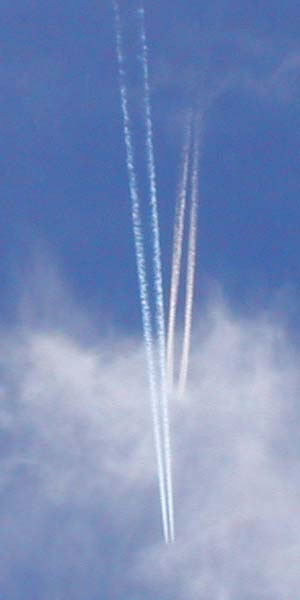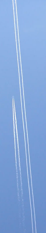 L'avion de gauche émet ce qui apparaît être de la condensation tandis que celle de droit émet vraisemblablement un épandage chimique puisqu’elle ne s'efface pas malgré l'avance qu’elle a avec sa voisine. Remarquez aussi l'aspect fibreux de la traînée |