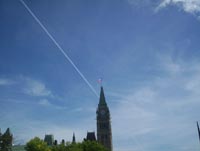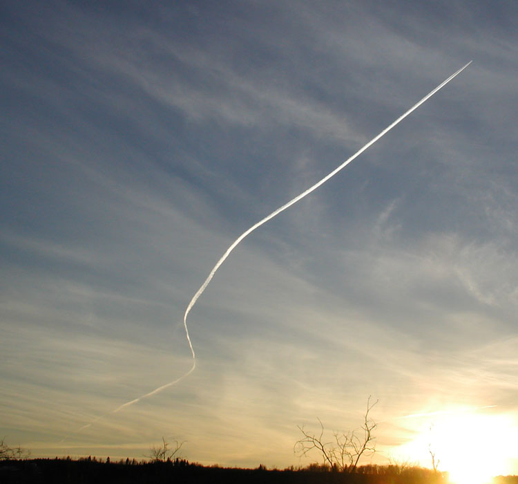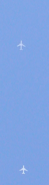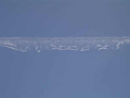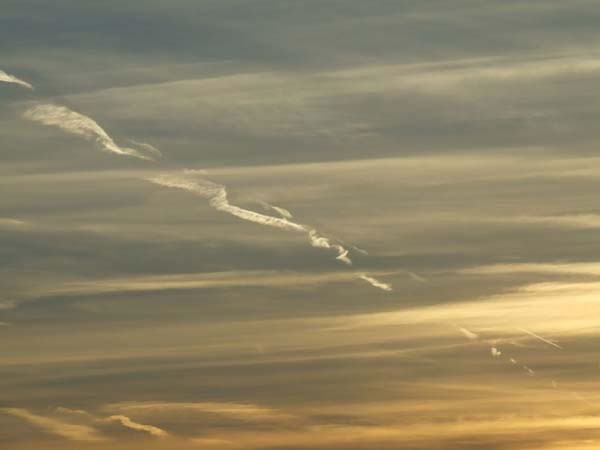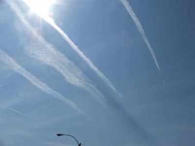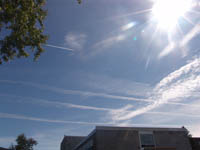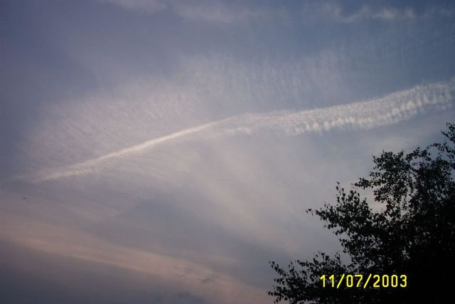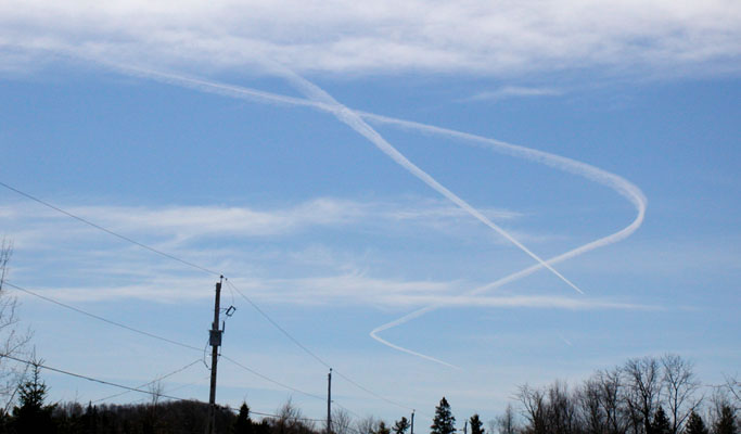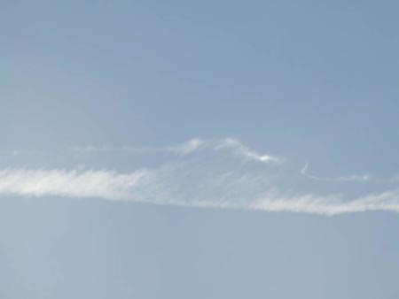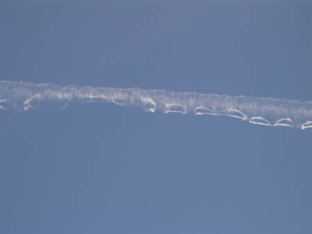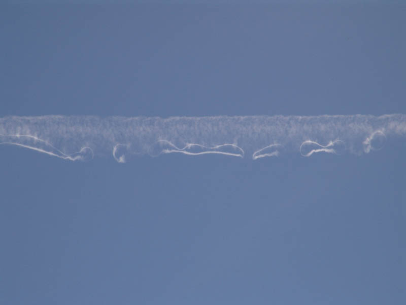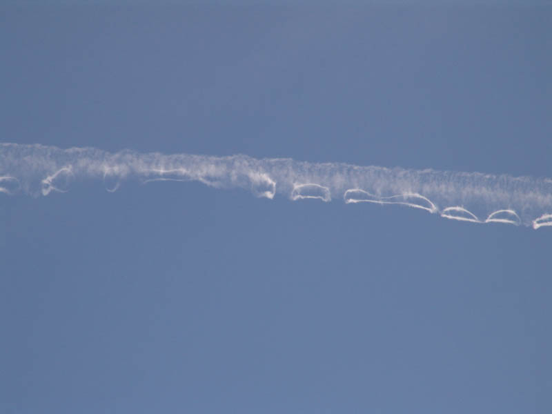 L'avion de gauche émet ce qui apparaît être de la condensation tandis que celle de droit émet vraisemblablement un épandage chimique puisqu’elle ne s'efface pas malgré l'avance qu’elle a avec sa voisine. Remarquez aussi l'aspect fibreux de la traînée |