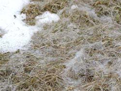 Ici ce sont des polymères se déposant sur le sol au printemps lors de la fonte des neiges, preuve physique de l'existence des chemtrails. J'ai prélevé et conservé un échantillon de cette "mousse". En un mot: Dégueulasse.